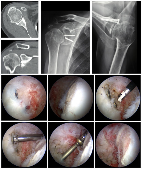 - Tauber, M.; Moursy, M.; Eppel, M.; Koller, H.; Resch, H. Arthroscopic Screw Fixation of Large Anterior Glenoid Fractures. Knee Surg. Sports Traumatol. Arthrosc. 2008, 16, 326–332. [Google Scholar] [CrossRef]