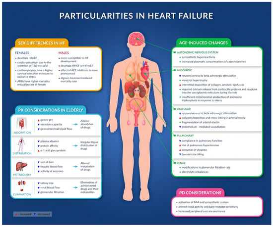 The pharmacodynamics of drugs, as well as their tolerability, may also be affected by several neuronal and endocrinological compensatory mechanisms in HF, including the activation of the renin-angiotensin (RAA) and sympathetic system. Moreover, nodal activity and baroreceptor sensitivity are affected, and peripheral vascular resistance is increased; these are aspects that could cause an altered response to administered drugs [13,84,85].