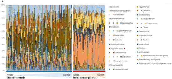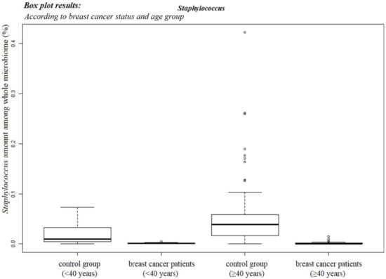 The abundance of Staphylococcus sp. in the microbiota was determined by analyzing the blood of the 96 patients with breast cancer and 192 healthy controls. As the human microbiome changes according to age, data from young and old breast cancer patients (under and above 40 years of age, respectively) were analyzed separately (Figure 3). The abundance of Staphylococcus sp. was higher in the healthy control group over 40 years of age.