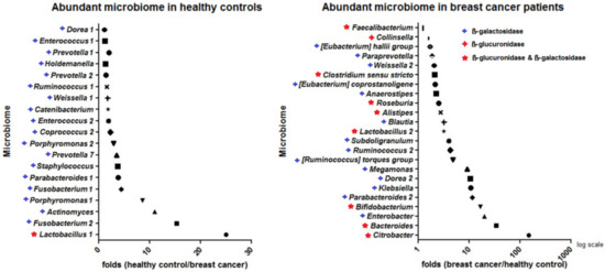 Comparison between blood microbiome composition of healthy controls and breast cancer patients. Three types of symbols indicate microbiota producing β−glucuronidase and/or β−galactosidase. As the data were acquired from sequencing at the genus level, when microbiota belonged to the same genus but to different species, the microbes with the same names were numbered differently.
