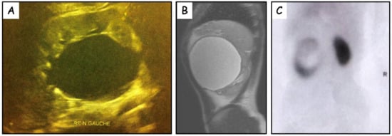 MRI or CT scan enabled the diagnostic of PPC in patient #2-3-4, demonstrating a very large intra-sinusal cystic mass adjacent to the collecting system (Figure 1B).