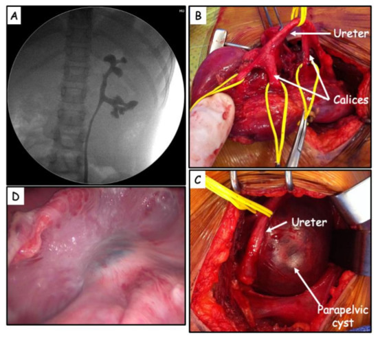 (A) Absence of renal pelvis demonstrated on retrograde pyelography. (B) Renal anatomy after subtotal excision of the cyst. No identifiable renal pelvis. Calyces communicating directly with the proximal ureter. (C) Large parapelvic cyst causing compression. (D) Intraoperative retrograde pyelography with methylene blue (visible in transparency in a renal calyx in the center of the photo). No communication was identified between the unroofed cyst and the renal pelvis.