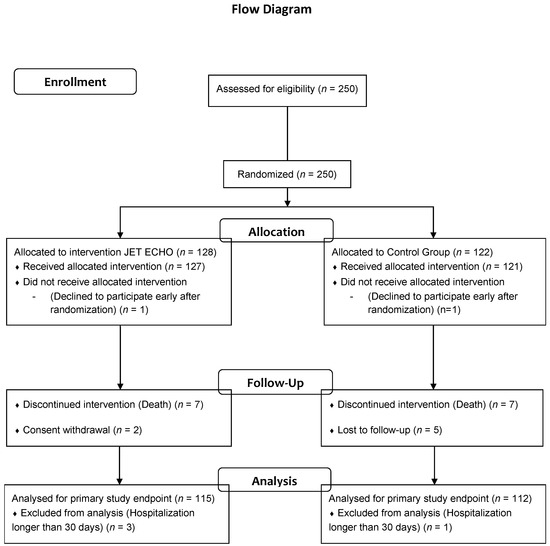From 15 November 2016 to 7 December 2018, 250 patients admitted for AHF in the university hospitals of Nîmes and Montpellier were recruited into the study. Of these patients, 128 were randomized in the JetEcho group and 122 in the SC group (Figure 1).