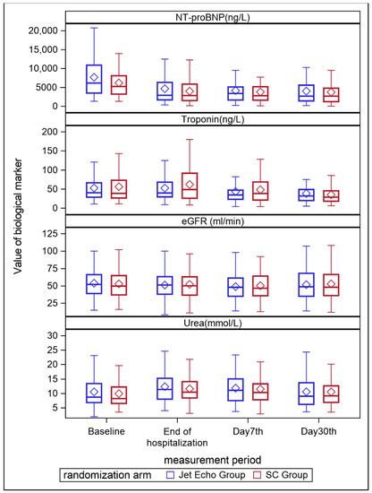Worsening HF occurred in 17 (14%) patients in the JetEcho group and 24 (20%) in the SC group, without statistically significant difference (RR 0.7; 95% [CI] 0.4 to 1.2; p = 0.2). The median length of stay during the index hospitalization was similar in the two groups (6 days, (4;10) p = 0.8). There was no weight difference from inclusion to discharge between the two groups (−0.40 kg (95% CI; −1.6–0.82) p = 0.5). Mean diuresis was no different with 1723 mL/24 h in the JetEcho group and 1766 mL/24 h in the SC group (p = 0.6). Other secondary outcomes of biological changes in values at D7 and D30 for, eGFR, blood urea nitrogen (BUN), Nt-proBNP, and troponin did not differ significantly between the two groups (Figure 2). The doses for diuretics (but also regarding the optimal doses of ACEs or MRA) were numerically higher in the JET echo group at discharge when compared to the standard group but these differences do not reach statistical significance (Appendix B).