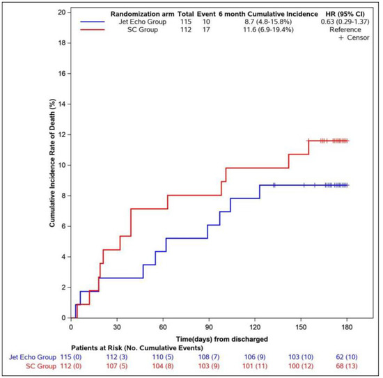 The cumulative incidence of death from any cause at six months from discharge was not different between groups with 8.7% in the JetEcho group and 11.6% in the SC group (HR 0.63, 95% [CI] 0.3–1.4, p = 0.3) (Figure 3).