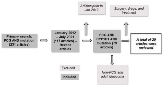 PubMed was searched from January 2012 to July 2021 for articles that included population-based studies/cross-sectional studies. The search terms were grouped in 16 combinations (Supplementary Materials Tables S1 and S2). The first search on “PCG and mutation” found 231 articles and dated back to 1984. This search was further filtered to include articles since 2012 (articles published in the past 10 years), resulting in a total of 117 articles. To be more specific and to answer the question about CYP1B1 mutation and its demographics, the following specific keywords were included: CYP1B1, ethnicity, developmental, consanguinity, demographic, etc. The search included patients from prenatal to 3 years of age. Articles about adult glaucoma, open and closed angle glaucoma, pharmacology, pathobiology, etc. were excluded (Figure 1).