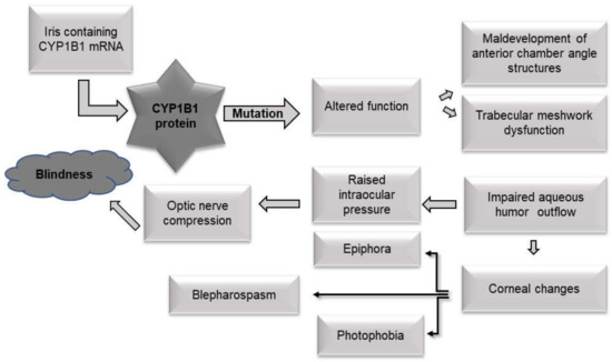The pathophysiology of primary congenital glaucoma (PCG). The most accepted theory for the pathophysiology of PCG resulting from the failure of the CYP1B1 downstream pathways in the development of functional ocular structures. Early blindness results from damage to the optic nerve due to elevated intraocular pressure (IOP) [20,21,22,23,24].