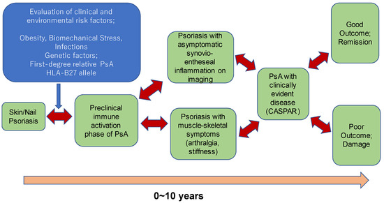 However, the disease course of PsA is not simple, and various patients follow distinct disease courses with an ever-expanding and fluctuating disease course. Novel biomarkers that distinguish patients who need early intervention are needed to fully prevent disease progression in those with a poor prognosis.