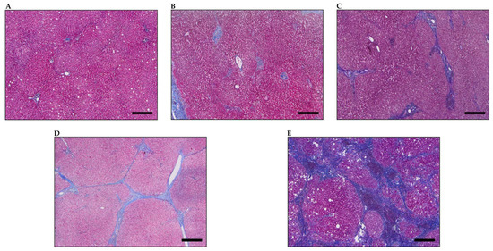 Representative images of Desmet score 0–4. (A–E) Representative liver histopathology of fibrosis score 0 (A), 1 (B), 2 (C), 3 (D) and 4 (E) referring to Desmet et al. [19] in Masson’s trichrome stain. Original magnification x4. Scale bars = 400 µm.