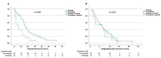 The median OS for patients without liver cirrhosis was 21.8 months (95% CI = 17.1–26.4 months), in comparison to 9.5 months (95% CI = 4.6–14.3 months) for patients diagnosed with liver cirrhosis, thus showing a significant difference between both groups (p = 0.007) (Figure 3A). This was in line with the three-, twelve-, and twenty-four-month OS rates, which were 89.4, 69.4, and 30.7% in patients with liver fibrosis and 53.8, 23.1 and 7.7% in cirrhotic patients, respectively. To further strengthen the role of cirrhosis on the outcome of iCCA patients, we evaluated the PFS in both cirrhotic and non-cirrhotic patients (Figure 3B). However, our data revealed that the median PFS for patients without cirrhosis was 6.6 months (95% CI = 5.1–8.1 months) in contrast to 5 months (95% CI = 2.6–7.4 months) for cirrhotic patients (p = 0.437) (Figure 3B). Moreover, the three-, six-, and twelve-month PFS rates were 63.7, 41.5 and 15% in patients with a non-cirrhotic liver, and 53.8, 35.9 and 9% in patients with cirrhosis.