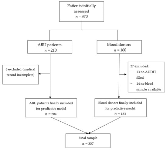 A total of 337 participants were included in this study after exclusions (due to incomplete data), including 204 in the ABU group and 133 participants in the blood donor group. You can see the flow chart of the study in Figure 1.