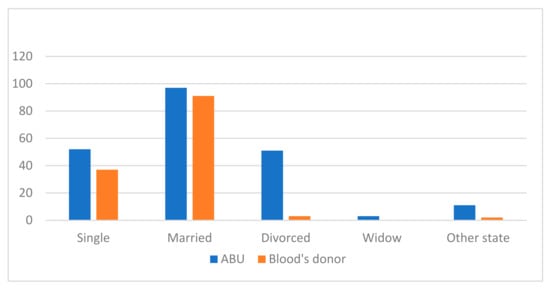 The mean ages in both groups were comparable, 45 years old for participants in the ABU group, with a standard deviation of 10.05, and a mean of 41 years old for participants in the blood donor group, with a standard deviation of 10.89. They had age ranges of (15–78) and (18–66), respectively, with the variances being homogeneous and reaching statistical significance (p < 0.000).