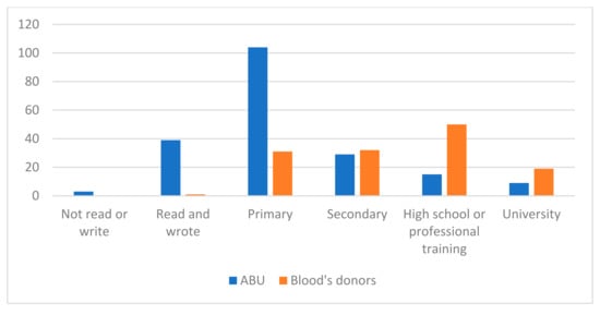 The predominant study level of the blood donors in our sample was high school and/or professional training (50 blood donors, 37.6%), followed by 32 blood donors with secondary education (24.1%), 31 blood donors with primary education (23.3%), 19 blood donors with university studies (14.3%), and only 1 blood donor (0.8%) read and write but did not have studies.