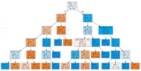 Figure 4 shows the final classification tree produced. Although this presented a somewhat lower predictive accuracy than the logistic regression, classification trees are easier to interpret, as well as capable of explaining their inference process. Our classification tree resulted in an accuracy of 79.4%, a sensitivity of 78%, and a specificity of 77.5%. Its positive predictive value was 81.3%, and the negative predictive value was 77.5%.