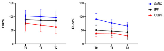 FVC and DLco percentages at diagnosis (T0) and at one- (T1) and two-year (T2) follow-up.