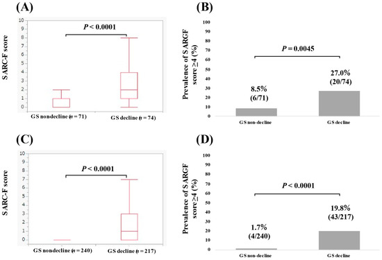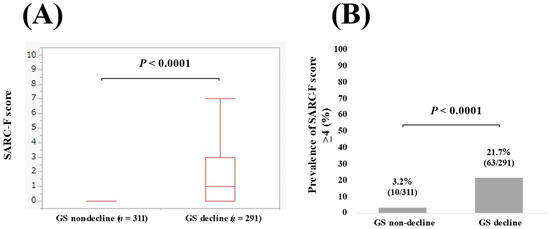 The median (IQR) SARC-F score in patients with GS decline (n = 291) and without GS decline (n = 311) was 1 (0–3) and 0 (0–0) (p < 0.0001, Figure 2A). The percentage of patients with a SARC-F score ≥ 4 in patients with and without GS decline was 21.7% (63/291) and 3.2% (10/311) (p < 0.0001, Figure 2B).