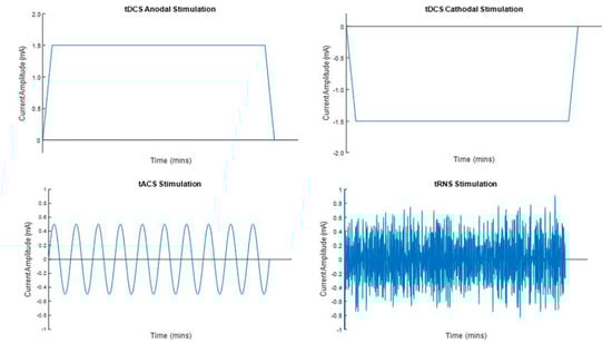 Stimulation waveforms for transcranial direct current stimulation (tDCS) (anodal and cathodal), transcranial alternating current stimulation (tACS), and transcranial random noise stimulation (tRNS). Reproduced from reference [59], https://doi.org/10.1007/s10545-018-0181-4, under the terms of the CC BY 4.0 license, http://creativecommons.org/licenses/by/4.0/ (accessed on 29 March 2022).