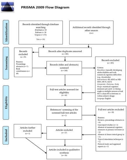 Several strategies were used to identify the final study sample. First, databases “PubMed”, “Embase”, and “Scopus” were systematically searched without starting time restrictions, until 4 February, 2022, according to the following expressions: (“numerical cognition” OR “numerical learning” OR “number sense” OR “numerosity discrimination” OR “arithmetic learning” OR “arithmetic problem solving” OR “arithmetic procedures” OR “arithmetic fact retrieval” OR “mental calculation” OR “mathematical learning” OR “mathematical problem solving” OR “mathematical calculation”) AND (“transcranial direct current stimulation” OR “transcranial random noise stimulation” OR “transcranial alternating current stimulation” OR “transcranial electrical stimulation”).