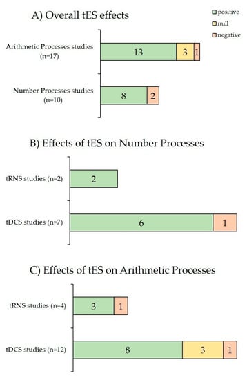 Refer to Figure 4 (panel A) for a visualization of the qualitative effects of tES techniques across all reviewed studies based on non-symbolic and symbolic number processing (positive results: 8 out of 10 reports) and arithmetic processing (positive results: 13 out of 17 reports).