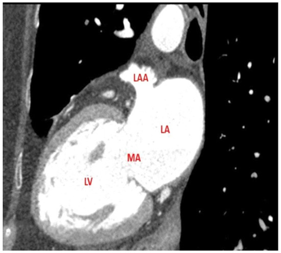 CT scan caption showing the absence of thrombus in the LA, including the LAA. LA: left atrium; LAA: left atrium appendage; LV: left ventricle; MA: mitral annulus.