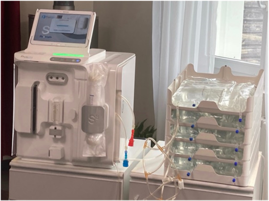 The S3 dialysis device has specific features intended to facilitate self-therapy and HHD. S3 consists of a monitoring device composed of a central processing unit integrating information and algorithms capable of driving extracorporeal blood and dialysate circuits. S3 relies on a bagged dialysate delivery system that uses disposable sterile and non-pyrogenic dialysis fluid presented in 5-L bags stored and disposed of horizontally during dialysis session in a rack system. Dialysis fluid is pumped through the hemodialyzer at low flow, single-pass mode in a closed circuit while spent dialysate is wasted to drain. The specific dialysate circuit facilitates ultrafiltration control but also offers an additional option for increasing internal filtration (push-pull technic). This technical feature is intended to enhance the convective transport phenomenon and can increase the clearance of middle and larger molecular weight substances. Total convective volume obtained from both ultrafiltration as weight loss and forced internal filtration transport (“push-pull” technology) could achieve 4.3 L/session (1.3 weight loss and 3.0 push-pull system), corresponding to 26 L/week, which is in agreement with high-flux HD in ultrafiltration-controlled mode [21,30,31,32]. Of note, the convective volume given by the machine corresponds to the total volume ultrafiltered (without the weight loss), including the additional ultrafiltration performed via the push-pull-like technique. It does not take into account the “internal filtration” phenomenon (ultrafiltration/backfiltration) due to the pressure equilibrium in the capillary dialyzer imposed by the volumetric control of the S3 machine. In addition, 100% of incident patients with recent treatment initiation had a residual kidney function with a diuresis >0.5 L/day, and HHD was used as part of an incremental dialysis program [33,34,35]. The blood and dialysate circuits are independent disposable tubing sets presented in a sterilized package ready to use and easily inserted on the S3 device by the patient himself. S3 has a tactile tablet that offers a friendly and quite intuitive interface for guiding or helping patients in their care task. Of note, the training period for patients (of 41 (28–56) days) mainly included the self-puncture training. Only a 3 week-period is needed for the handling and training use of the S3 monitor.