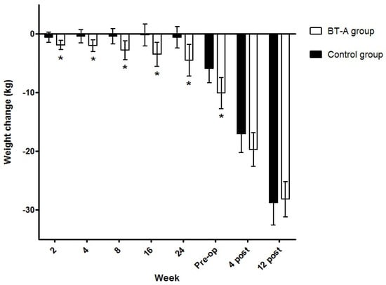 Changes in body weight after intragastric injections. Lines represent mean body weight change over time for each treatment group. * Statistically different means versus control group. Abbreviations: BT-A, botulinum toxin A: pre-op, preoperative; post, postoperative.