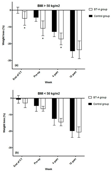 (a) Changes in body weight percentage at perioperative period in patients with BMI over 50 kg/m2; (b) Changes in body weight percentage at perioperative period in patients with BMI below 50 kg/m2. * Statistically different means versus control group. Abbreviations: BT-A, botulinum toxin A; CT, clinical trial; pre-op, preoperative; post, postoperative.