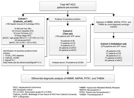 Three independent cohorts of patients with liver disease were involved in this study. Cohort 1 (108 snap-frozen tissues from 86 HCC patients) was used for whole transcriptome NGS RNA-seq analysis. Cohort 2 (771 samples from 100 patients) was used as a test set for performing ELISAs (enzyme-linked immunosorbent assay) on the 10 candidate serum markers, and cohort 3 (1148 samples from 279 patients) was used as a validation set for the four potential serum markers (Figure 1). Written informed consent was obtained from all subjects in accordance with the Declaration of Helsinki, and the study was approved by the Institutional Review of Board (IRB) of the Songeui Campus of the Catholic University of Korea College of Medicine (IRB approval No: MC12EISI0106, MC12SNMI0184).