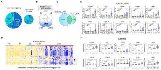 Liver transcriptome scans of characteristic molecular signature in healthy controls and patients with liver disease. (A) Pie chart analysis according to gene types and signal peptides of protein coding genes. (B) Venn diagram analysis showing genes overexpressed in the early-stage HCC and advanced HCC groups, but not overexpressed in the chronic hepatitis and liver cirrhosis groups. (C) Venn diagram analysis of selected genes in (B) from two different RNA-Seq datasets (Catholic_LIHC and TCGA_LIHC). (D) Heatmap analysis of 737 HCC-associated gene signatures in Catholic_mLIHC. (E,F) Expression changes of 10 candidate marker genes in multistage liver disease patients of (E) Catholic_mLIHC (cohort 1, n = 108) and (F) GSE6764 (n = 55). Statistically significant differences were determined using Welch’s t test.
