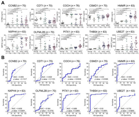 Concentration of 10 secretory proteins in serum in the test set. (A) Expression of 10 candidate gene products based on ELISA are presented as an aligned dot plot. Black horizontal lines are means, and error bars are SEs. Mann–Whitney U test, p < 0.05 *, p < 0.01 **, p < 0.001 ***. CH, chronic hepatitis B virus infection; LC, liver cirrhosis; eHCC, early-stage hepatocellular carcinoma; aHCC, advanced hepatocellular carcinoma. (B) ROC curve analysis of the secretory proteins encoded by the 10 candidate genes. Statistically significant difference of AUC is compared with reference line (AUC = 0.5).