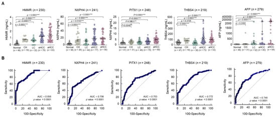 Currently, there is no single serum biomarker with the sensitivity and specificity required for effective HCC screening. Therefore, it is necessary to develop multiprotein serum marker panels to improve specificity in detecting HCC at very early stages of the disease. To investigate the suggested serum markers as panel proteins for the early detection of HCC, we selected patients who underwent screening for all five proteins (HMMR, NXPH4, PITX, THBS4 and AFP) and performed comparative analysis for detecting HCC at the early stage. To this end, 218 patients from the total 379 patients of cohort 2 and cohort 3 were recruited as a comparison set. The clinical characteristics of 132 HCC patients, including 69 with eHCC and 63 with aHCC, are summarized in Supplementary Table S4. Non-tumor groups included 47 NL and 39 patients with non-malignant chronic liver disease (CH n = 16, LC n = 23).