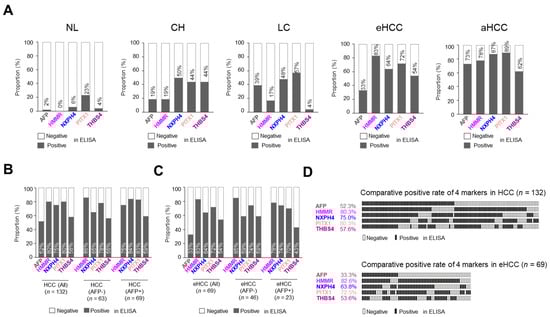Diagnostic outcomes of four serum markers for the diagnosis of HCC and early-stage HCC. (A) The rate of patients with positive AFP and markers in each liver disease status. (B) The rate of patients with positive AFP and markers in all patients with HCC and for four markers according to AFP status in all patients with HCC. (C) The rate of positive patients for AFP and markers in patients with early-stage HCC and for markers by AFP status in patients with early-stage HCC. ROC, receiver operating characteristics. HCC, hepatocellular carcinoma. NL, normal liver. CH, chronic hepatitis B virus infection. LC, liver cirrhosis. (D) The bar chart showing rate with positive AFP and markers in all patients with HCC (upper panel) and patients with early-stage HCC (lower panel).