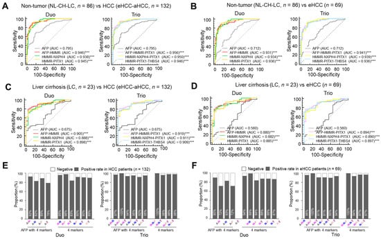 Combinations of AFP with four serum markers for the diagnosis of HCC and early-stage HCC. (A) ROC curve of AFP or combination of two markers for patients with all HCC (n = 132) versus all controls (n = 86). ROC curve of AFP or combination of three markers for patients with all HCC (n = 132) versus all controls (n = 86). (B) ROC curve of AFP or combination of two markers for patients with early-stage HCC (n = 69) versus all controls (n = 86). ROC curve of AFP or combination of three markers for patients with early-stage HCC (n = 69) versus all controls (n = 86). (C) ROC curve of AFP or combination of two markers for patients with all HCC (n = 132) versus liver cirrhosis (n = 23). ROC curve of AFP or combination of three markers for patients with all HCC (n = 132) versus liver cirrhosis (n = 23). (D) ROC curve of AFP or combination of two markers for patients with early-stage HCC (n = 69) versus liver cirrhosis (n = 23). ROC curve of AFP or combination of three markers for patients with early-stage HCC (n = 69) versus liver cirrhosis (n = 23). (E) The rate of positive patients for AFP in pairs with new markers or pairs of new markers in all patients with HCC. The rate of positive patients for triplet combinations of AFP with new markers or triplets of the new markers in all patients with HCC. (F) The rate of positive patients for pairs of AFP with new markers or pairs of new markers in patients with early-stage HCC. The rate of positive patients for triplet combinations of AFP with new markers, or new marker triplets in patients with early-stage HCC. p < 0.001 ***.