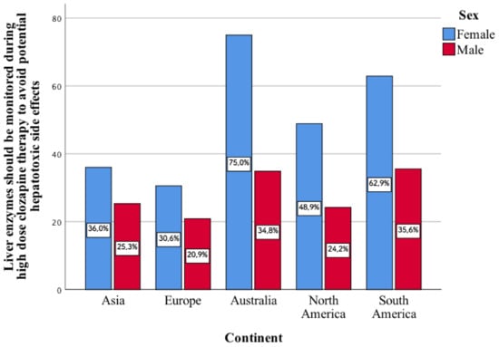 Only 31.6% of the psychiatrists surveyed believe that while taking high-dose clozapine, liver enzyme levels should be monitored to avoid potential side-effects related to hepatotoxicity. This type of statement enters into a statistically significant relationship with the gender of psychiatrists from individual continents. The greater part of the surveyed women, compared to men, indicated that they agree with this type of aspect (Figure 1). This concerns North America (p < 0.001) and South America (p < 0.001).