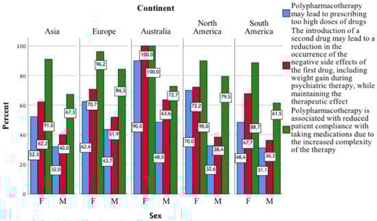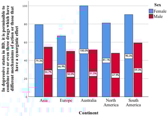 One of the aspects mentioned in the above table enters into a statistically significant correlation in all continents. It concerns whether, in depressive states in bipolar disorder, it is permissible to combine two or even three drugs with different mechanisms of action or those that have a synergistic effect. In each of the individual continents, a greater percentage of the surveyed women chose this type of response as compared to men (p < 0.001, Figure 2).
