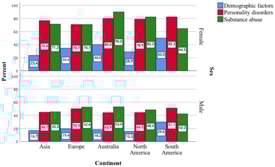 One of the least frequently indicated factors, i.e., demographic ones, draws attention. They were indicated by a small percentage of psychiatrists, and, as it turns out, they enter into a statistically significant correlation with their gender in individual continents. It turns out that more women than men stated that these demographic factors influence the occurrence of polypharmacotherapy. The largest differences in terms of sex are characteristic of demographic factors in Europe (p < 0.001). More women than men on continents also indicated factors such as personality disorders and substance abuse. The biggest differences in this case are in North America (p < 0.001) (Figure 4).