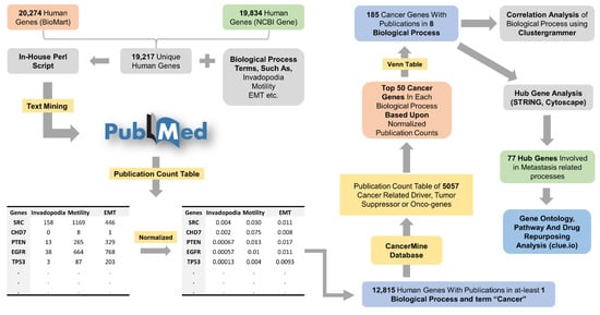 Targeting metastasis is challenging due to its complexity and involvement of multiple steps. Therefore, exploring key genes and signaling pathways involved in key driver traits of the metastatic cascade and targeting them can be promising to impede metastasis. Based on PubMed citation counts, Meirson et al. have shown there is a gap between the growing arsenal of papers focusing on metastasis compared to available anti-metastatic drugs and therapy. Besides developing new anti-metastasis drugs, drug repurposing can be used due to its cost-effectiveness and reduced timeline to advance treatment [38]. In this study, we utilized 19,217 human genes to perform text-mining on the PubMed database to study genes involved in cancer and metastasis-associated processes such as invadopodia, motility, movement, metastasis, invasion, wound healing, EMT, and podosome. Next, by using a normalized text-mining score, we short-listed significant drivers, tumor suppressors, or oncogenes associated with each of the processes. Finally, we utilized these genes for hub gene analysis to prioritize candidate genes involved in multiple processes. These candidate genes were further used for drug re-purposing to improve treatment for metastasis prevention.