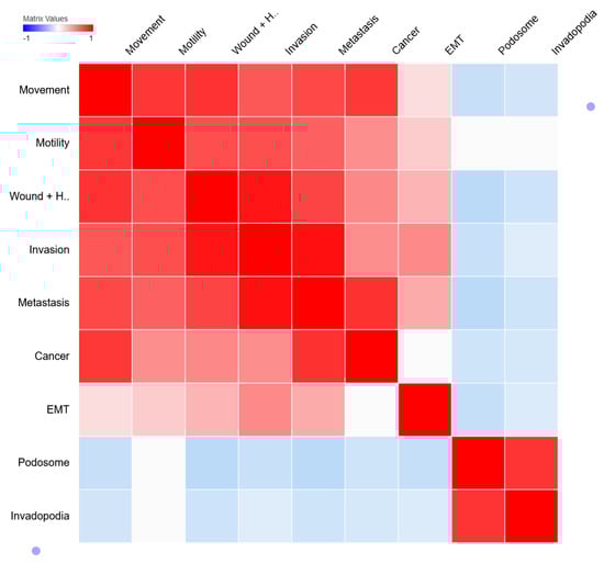 Correlation between metastasis-related processes. The column similarity matrix represents the similarity between metastasis-related processes whereas red (1), white (0), and blue (−1) represent positive, neutral, and negative correlations (measured as 1—cosine-distance).