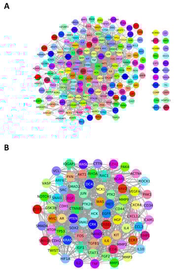 Protein–protein interaction (PPI) networks of genes and significant gene modules. (A) High-confidence (0.7) PPI network (STRING) of 185 unique genes involved in metastasis-related processes. (B) PPI network of the candidate hub genes (MCC and MCODE).
