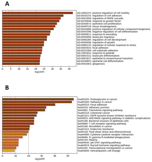 Significant gene ontology enrichment terms and enriched pathways of the candidate hub genes. (A) Top 20 GO terms. (B) Top 20 enriched KEGG pathways. GO and pathway analysis was acquired from the Metascape tool. p < 0.01. Dark colors represent a significant enrichment of more genes compared to lighter ones.
