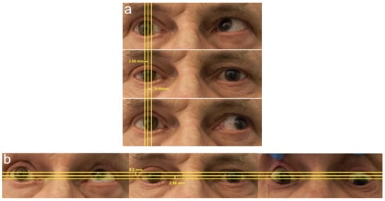 Measurement of eye motility in millimeters: (a) the horizontal direction (temporal and nasal); (b) the vertical direction (up and down) using a previously described method by Guthoff et al. [21]. Source: Division of Ophthalmology and Ocular Oncology, Jagiellonian University Medical College; own material.
