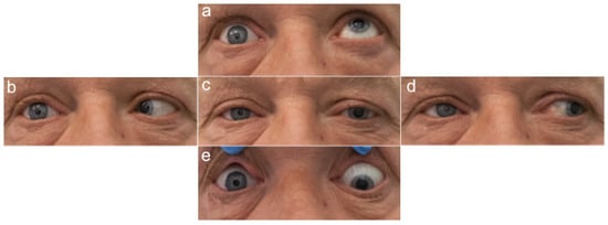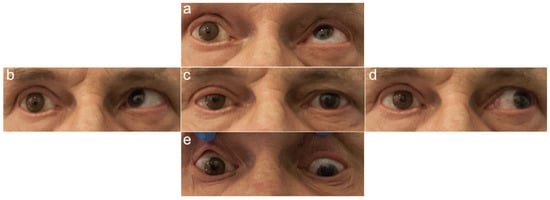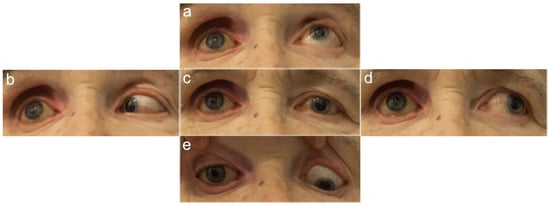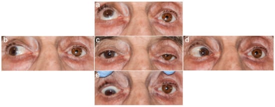 The investigators who assessed the photographs and performed the measurements were blinded to patient data, such as the presence of an orbital implant and the type of prosthetic eye. The photographs of the healthy and prosthetic eyes in the five cardinal directions of gaze are presented in Figure 2, Figure 3, Figure 4 and Figure 5.