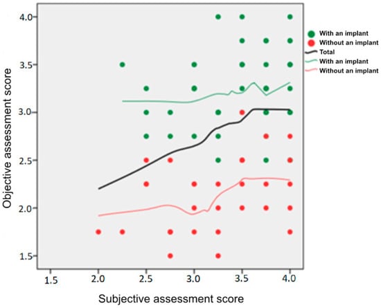 A scatterplot of a correlation between the overall objective and subjective assessment scores in patients with and without an orbital implant. The loess curves represent the mean objective score for a given level of the subjective score.