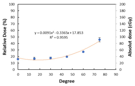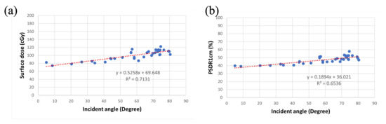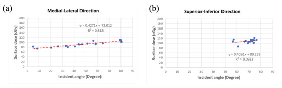 3.3. Relationship between Incident Angle and Surface Dose among Various Sizes of Breast Accessories