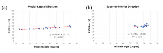 3.4. Relationship between Incident Angle and PSDR1cm among Various Sizes of Breast Accessories