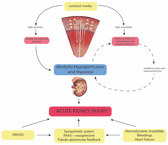 The pathophysiology of CA-AKI is multifactorial, and it is based on a combination of mechanisms. Despite not being completely elucidated, these mechanisms include direct cytotoxic effects, and autocrine, paracrine and endocrine factors, which act on the pre-existing individual risk profile (Figure 1).