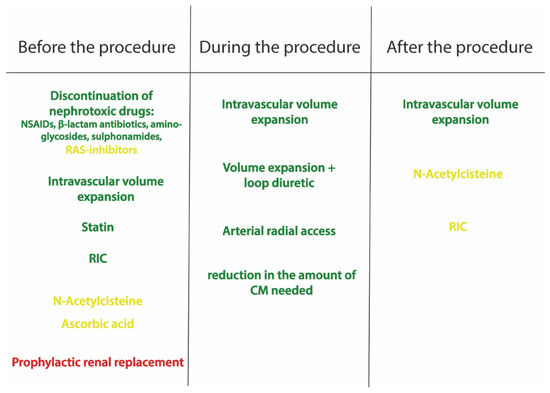 The different strategies proposed for the prevention and treatment of contrast-associated acute kidney injury. The green therapies have been shown to reduce contrast-associated acute kidney injury, the yellow therapies are controversial, while the red treatment is not effective. NSAIDs: non-steroidal anti-inflammatory drugs; RAS: renin–angiotensin system; RIC: remote ischemic conditioning; CM: contrast media.
