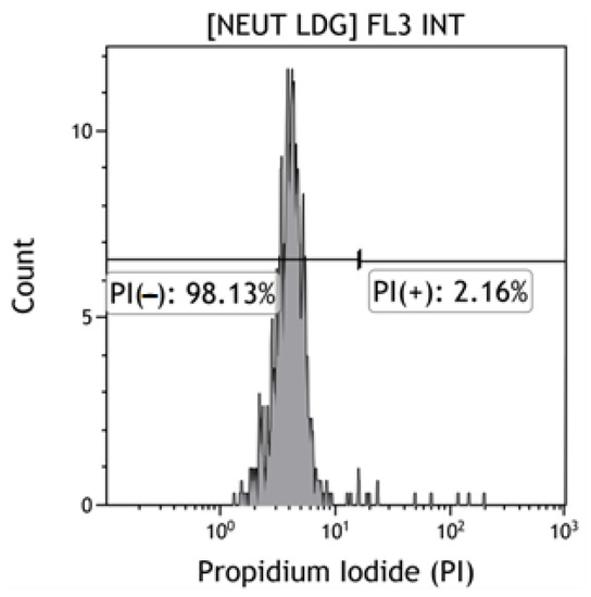 The assessment of the viability of LDG was performed in a cell isolate that was obtained from the PBMC fraction by centrifugation in a density gradient (Histopaque reagent, Thermo Fisher Scientific, Waltham, MA, USA) prior to cytometric analysis. Propidium iodide (IP) (eBioscience Propidium Iodide, Thermo Fischer Scientific) was used to stain apoptotic cells (PI−). 10 µL of PI was added to 100 µL of LDG isolate (1 × 106 cells), after which the cells were incubated for 5 min. Then 2 mL of buffered saline without calcium and magnesium ions (PBS, Biomed) was added and centrifuged 5 min at 300× g in centrifuge (Centrifuge 5810R, Eppendorf, Hamburg, Germany). The supernatant was discarded and the labelled LDG were suspended in 400 µL of a buffered saline solution without calcium and magnesium ions. Shortly thereafter, the samples were cytometrically analyzed. It was shown that the LDG (PI−) population was characterized by similar high viability in the control and study groups (>98%), the minimum viability in both groups was >75%, and the maximum reached 99% (Figure 1).
