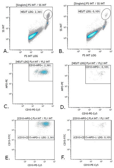 Exemplary analysis of the immunophenotype of LDG (CD10+ CD15+) with the expression of MPO+ antigen in patients with autoimmune hepatitis and in the control group. (A,B) Cytograms. Percentage of single cells relative to FSC detector and SSC (“NEUT LDG Gate”). (C,D) Cytograms. Percentage of cells positive for CD10 antigen and MPO (“CD10+ MPO+ Gate”). (E,F) Cytograms. Percentage of LDG positive for antigens: CD10, CD15, MPO+ (“CD10+ CD15+ MPO+ Gate”). (A,C,E) Cytograms—study group. (B,D,F) Cytograms—control group.