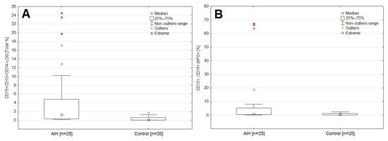 The median CRP was significantly higher in the study group as compared to the control group (1.5 vs. 3 mg/dL; p = 0.0157). In patients with AIH, a significantly higher median percentage was observed in the case of: LDG (1.2 vs. 0.1; p = 0.0001) and LDG fractions showing MPO expression (0.8 vs. 0.3; p = 0.0017), compared to the control group. (Supplementary Table S1, Figure 4A,B).
